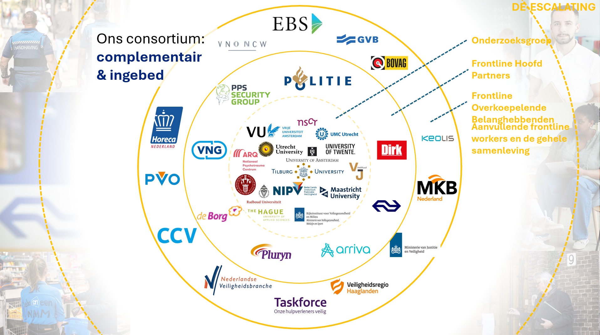 Onder aanvoering van de Vrije Universiteit Amsterdam is een gezamenlijke subsidie aanvraag gehonoreerd voor grootschalig onderzoek rondom escalatie en de-escalatie van conflicten tussen professionals en burgers. De onderzoekers bestuderen met behulp van video, draagbare sensoren en interviews duizenden interacties die in het dagelijks leven voorkomen. Vervolgens worden er strategieën ontwikkeld om agressie en geweld te voorkomen of te verminderen. Ook wordt direct onderzocht of deze de-escalatie strategieën effectief zijn. In dit project werkt de praktijk samen met wetenschappelijke partners om professionals beter te maken in het de-escaleren van agressie in hun werk.